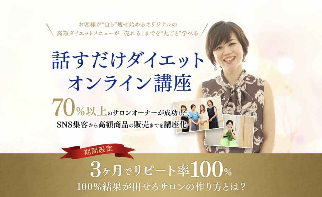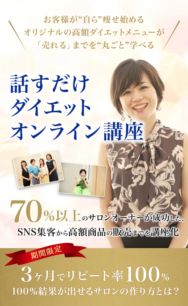 私や協会のメンバー達が、子育てや家事と両立しながら月商100万円~300万円超のサロン経営を実現できた、「話すだけダイエット」のエッセンスをまとめてお伝えしています。実際に協会メンバーが学んでいることと同等の内容を学ぶことができます。
