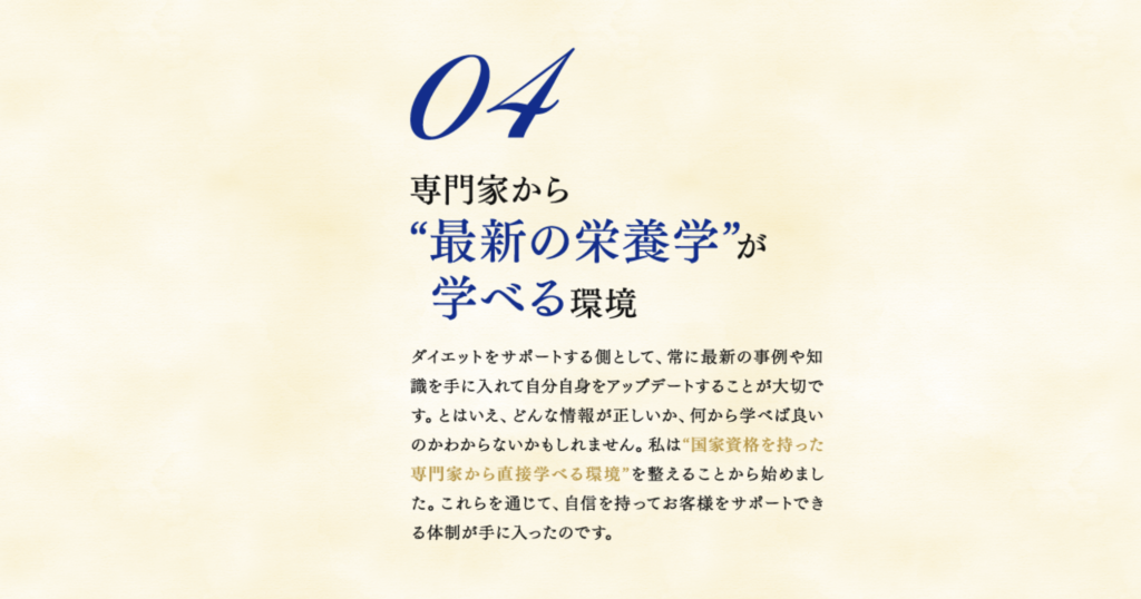 本講座では、「食べても痩せる、無理なく続く、正しい栄養学の知識が得られる環境」、「売り込まずに売れるオリジナル高額商品の設計方法」「来店から成約までスムーズに決まる流れ」「オンラインの仕組みとSNSブログ集客」まで